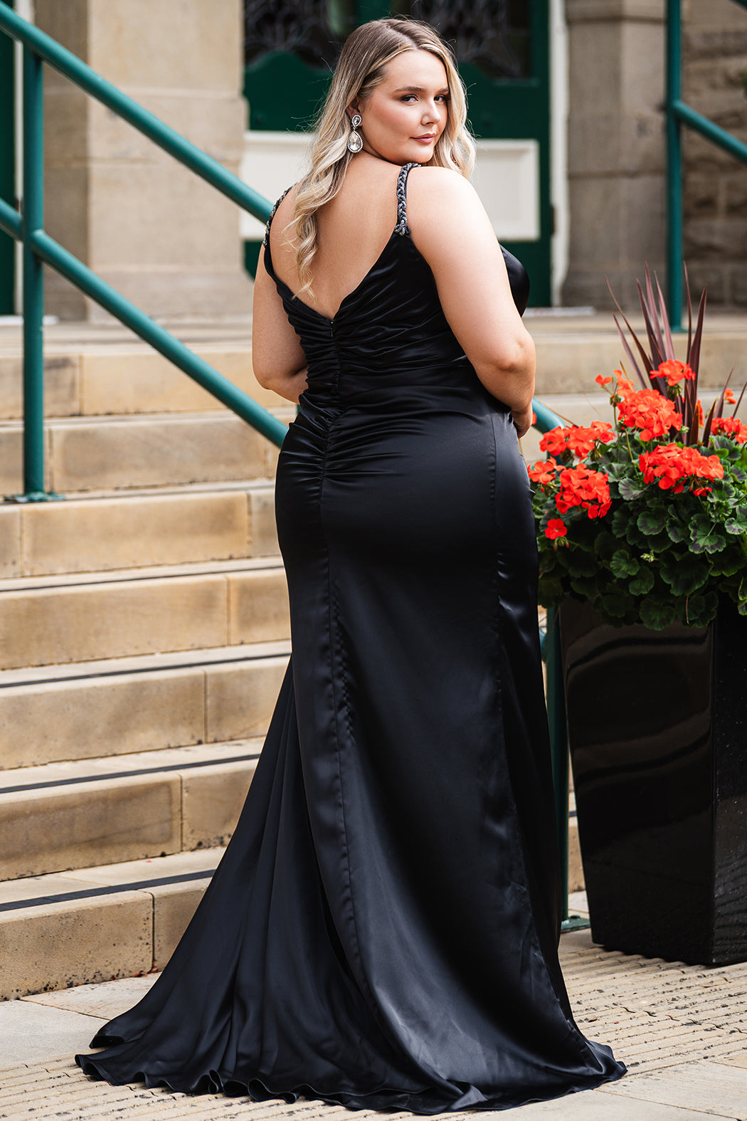 Satin fitted gown with front side ruching, jewelled straps, side train and a thigh high slit.