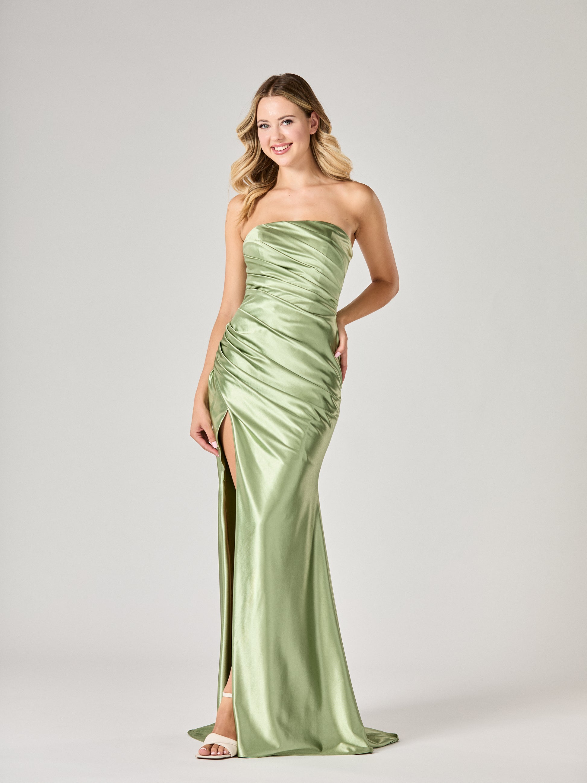Fitted satin gown with a strapless bodice, lace up back and a thigh high leg split.