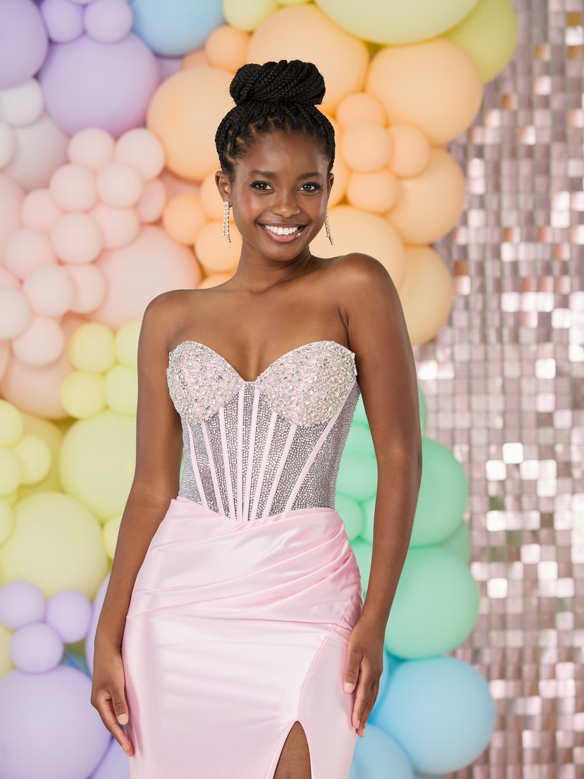 A fitted satin gown featuring featuring a mesh corset bodice, diamante details and a thigh high leg split.
