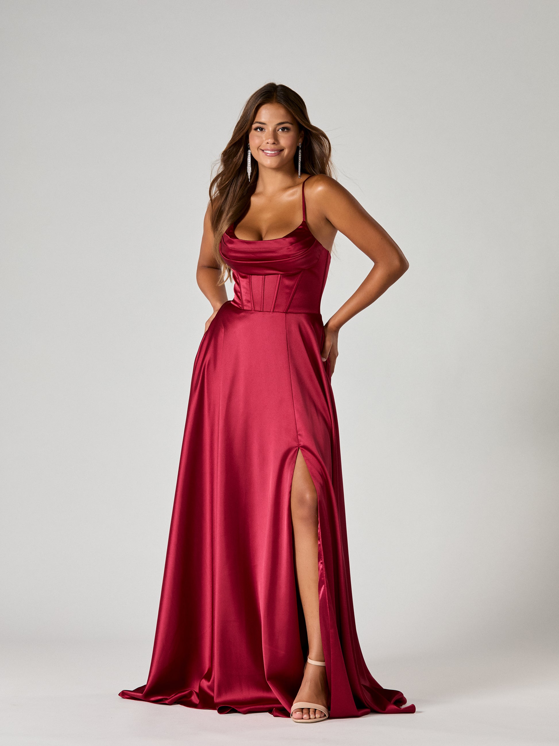 A stunning satin A - line gown with a corset bodice, lace up back and a leg split.